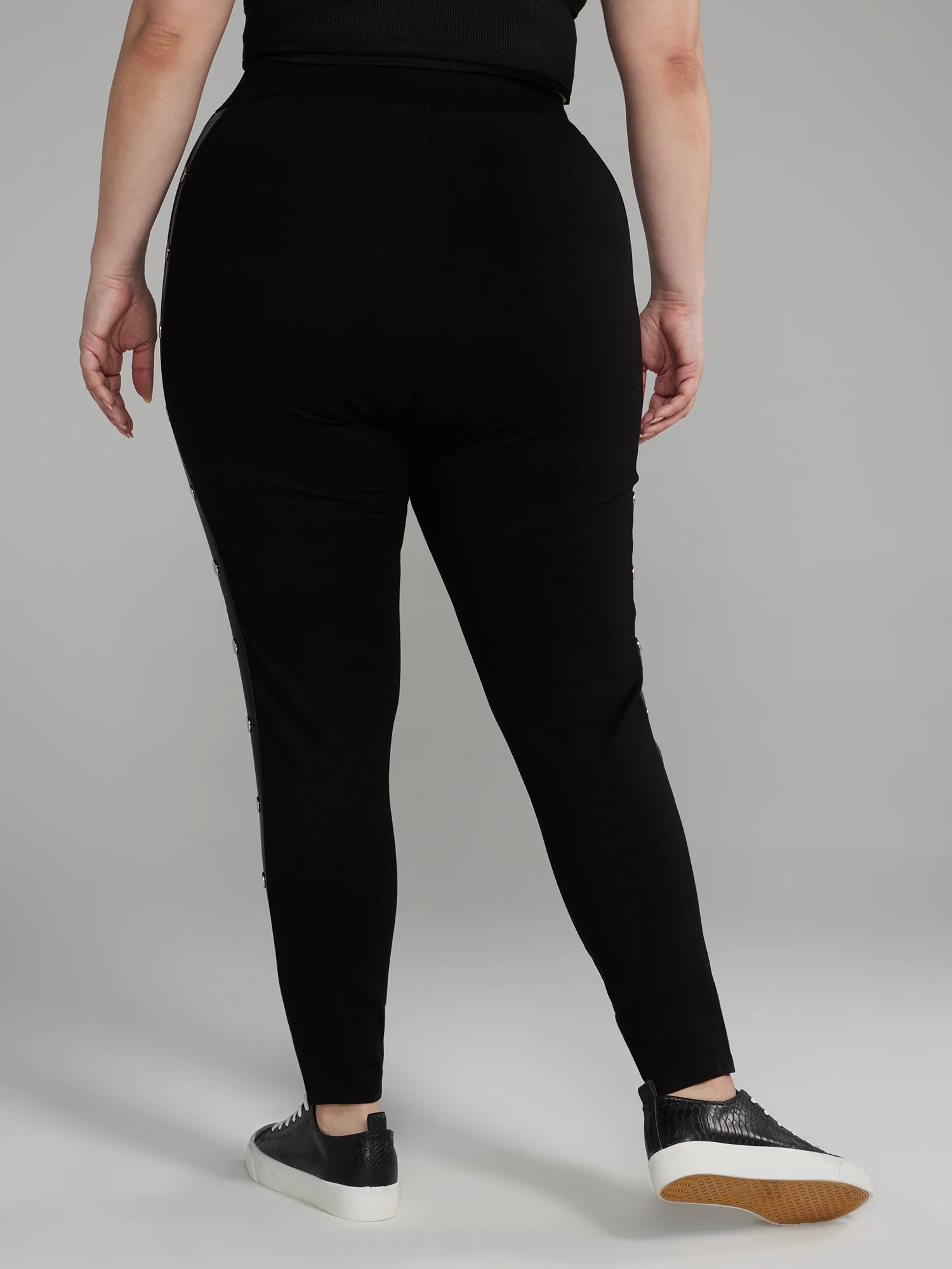 Sass in every step. Confidence in every stretch. These leggings are meant to keep you cute and stylish. With a uniquely designed button detail layered on top of a faux leather strip on the sides and that stretchy comfort, this beauty is sure to own a place in your wardrobe. Style it with a bodysuit and cardigan, add booties and own that style game like a BOSS.